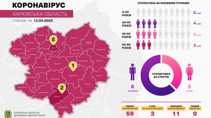 По состоянию на утро 12 апреля в Харьковской области 11 подтвержденных случаев заболевания COVID-19, три новых случая за сутки.