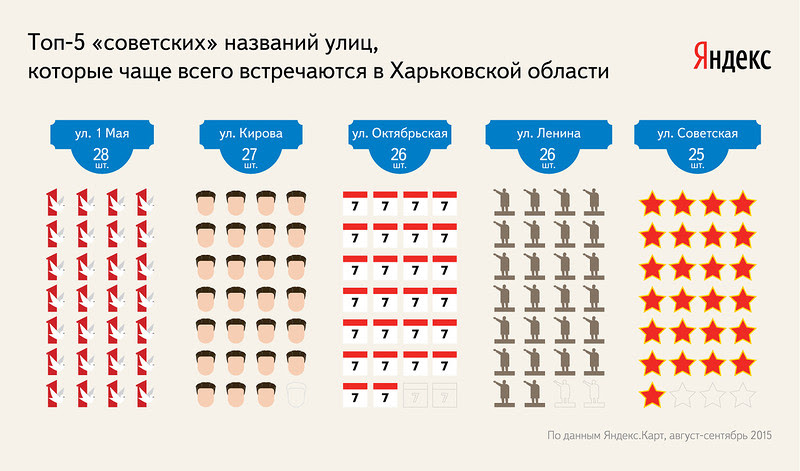 Самое популярное среди названий улиц в этом регионе – улица 1 Мая, которая встречается на картах Харькова и области 28 раз. Кроме них, в областном центре есть еще площадь и въезд с таким же названием. А вот как выглядит топ-5 «советских» наименований в населенных пунктах Харьковщины: