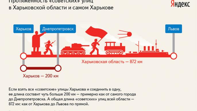 Если взять все «советские» улицы Харькова и соединить в одну, ее длина составит чуть больше 200 км – примерно как от самого города до Днепропетровска. А общая длина «советских» улиц всей области – 872 км: как от Харькова до Львова по прямой.