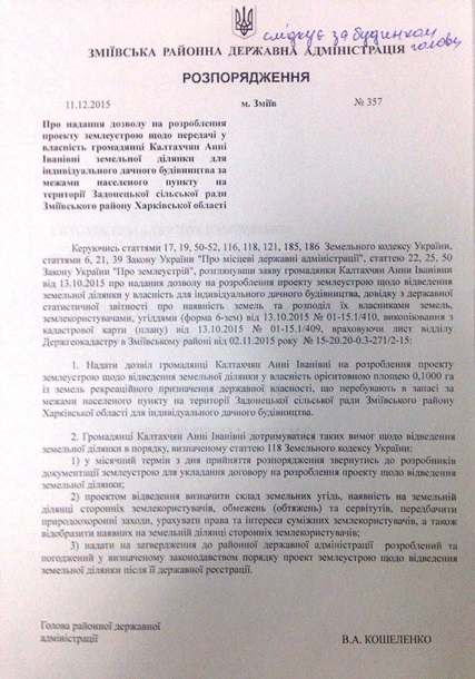 Сам же глава Змиевской РГА Виталий Кошеленко отрицает передачу земель в частную собственность, также указывая на то, что это, прежде всего, не в его компетенции.