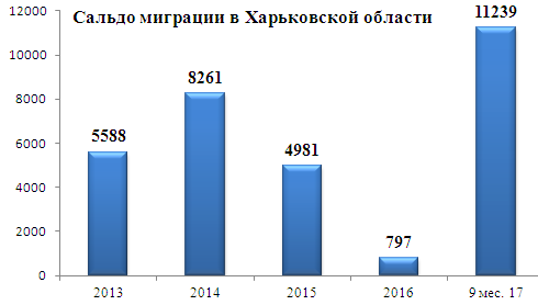 Только по официальной статистике за 9 месяцев 2017 года миграционный прирост населения в Харьковской области составил 11239 человек (за 9 мес. 2016 года – 1378 человек).