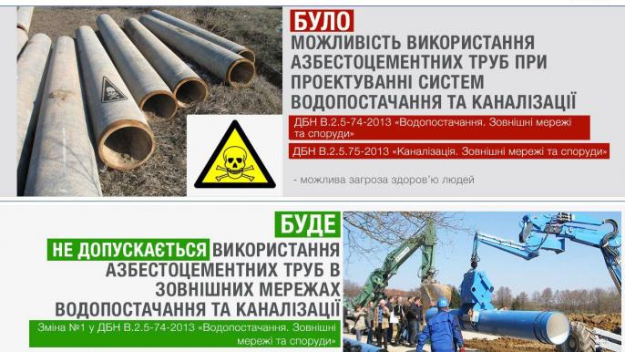 В новых изменениях в государственных строительных нормах "Водоснабжение. Внешние сети и сооружения" и "Канализация. Внешние сети и сооружения" исключена возможность использования асбестоцементных труб при проектировании напорных водоводов и сетей водоснабжения, а также канализационных трубопроводов.
