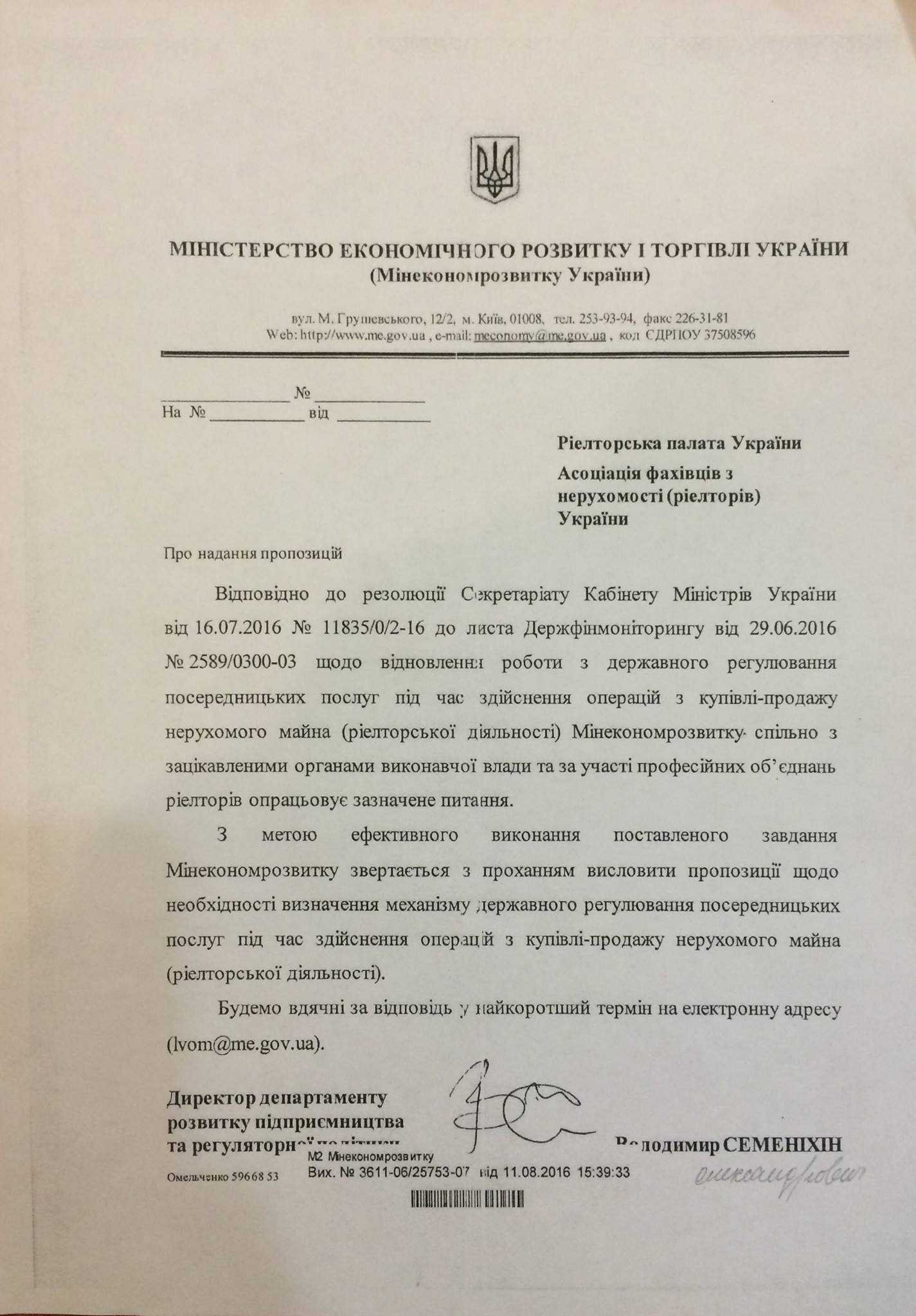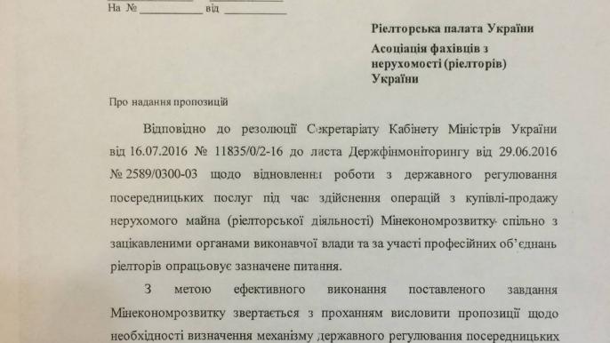 Минэкономразвития Украины намерены вместе с риелторским сообществом подготовить законопроект "О государственном регулировании посреднических услуг на этапе купли/продажи недвижимого имущества (риелтерской деятельности)".