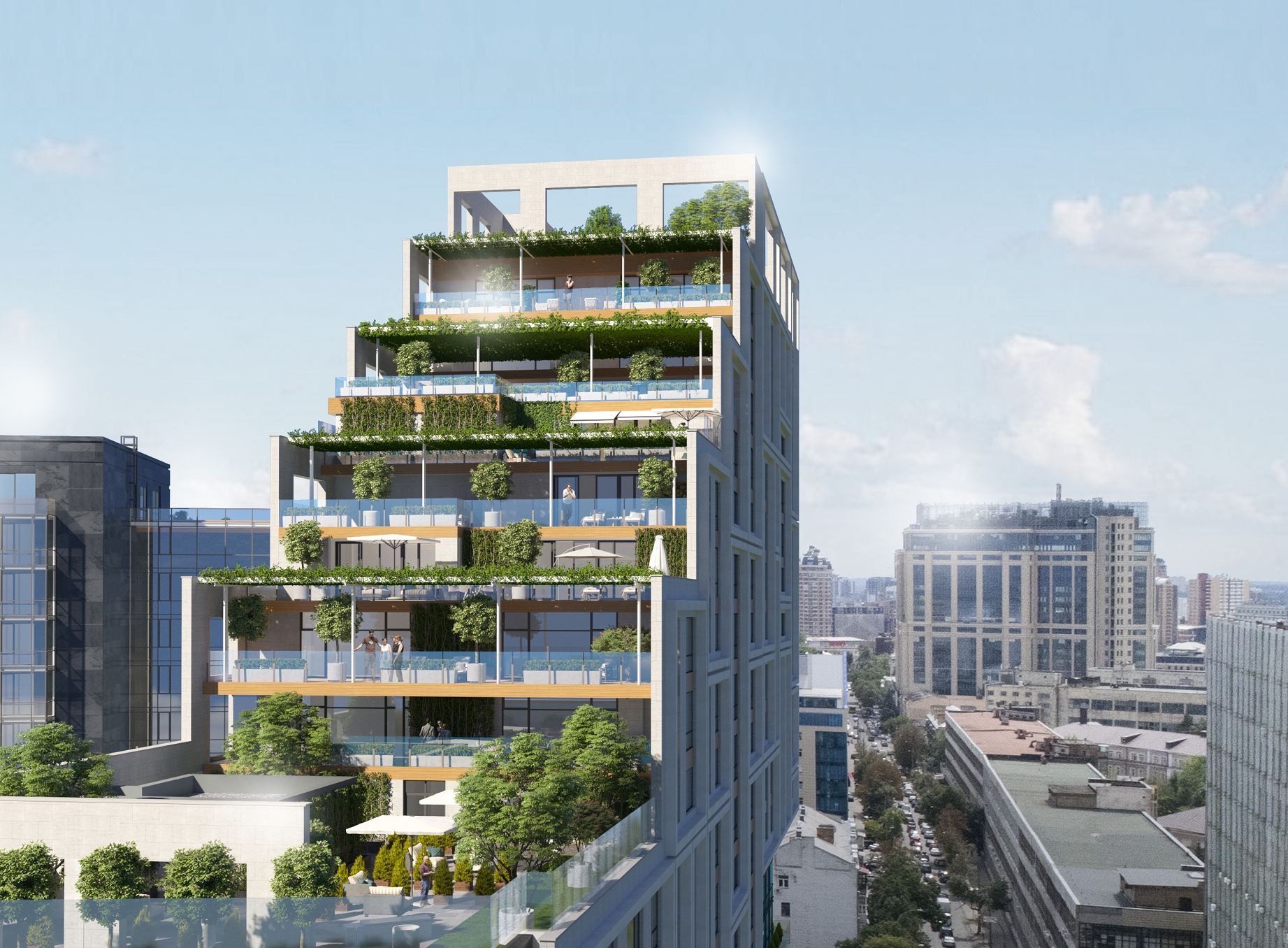 Архітектура комплексу вирізняється каскадною поверховістю від 7 до 16 поверхів та великими панорамними вікнами, що забезпечують природне світло та чудові види на місто й Дніпро. Фасад виконано в сучасному стилі з нейтральними кольорами та елементами “під дерево”, що підкреслює престижність будинку.