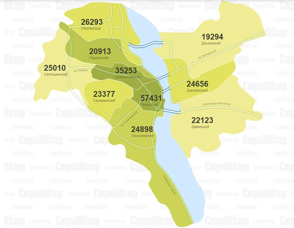 В последней тройке разместились Дарницкий район – 22 123 грн. за кв. м, Подольский – 20 913 грн. за кв. м и Деснянский район, где метр квадратный может обойтись в 19 294 грн. Эти три района также уже на протяжении долгого времени могут похвастаться самым бюджетным жильем.