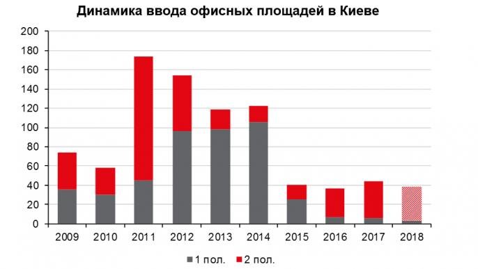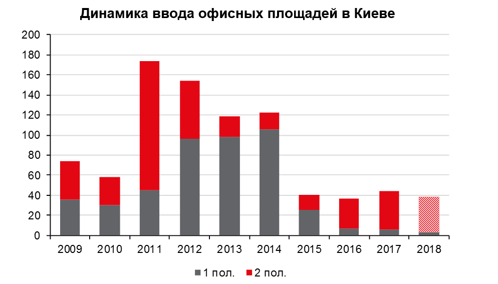 Одной из причин уменьшения объема незанятых помещений является низкий объем ввода. Во 2-м квартале на рынок вышел только один объект – корпус В2 бизнес-центра Unit City (класс В) площадью 2,9 тыс. кв. м. С учетом того, что в 1-м квартале новых объектов не появилось, ввод за 1-е полугодие 2018 года стал рекордно низким за всю историю рынка качественных офисных площадей Киева.