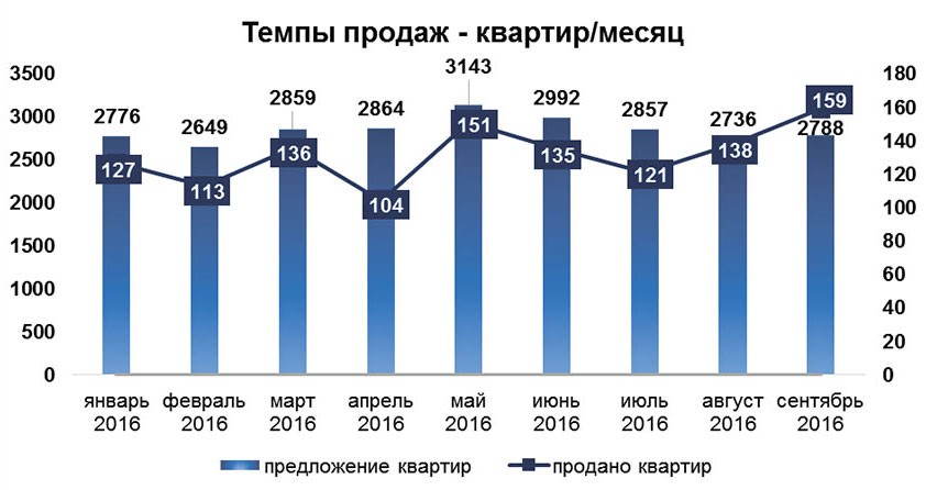 В третьем квартале 2016 года было продано 418 квартир бизнес-класса. Этот показатель выше, чем в первом и втором квартале, а количество проданных квартир в сентябре стало максимальным с начала года.