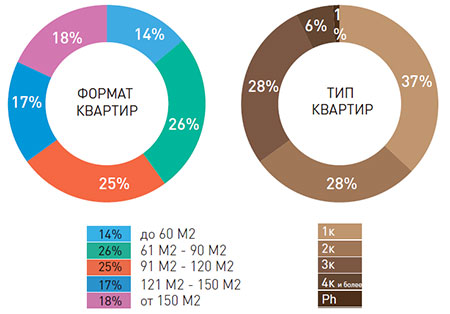 В структуре предложения квартир бизнес-класса преобладают однокомнатные – их доля в общем количестве предложений составляет 37%, доля предложения двух- и трехкомнатных квартир одинакова – 28%. При этом чуть больше четверти предложений (26%) – это квартиры площадью от 60 до 90 кв. м, еще почти столько же (25%) – от 90 до 120 кв. м.