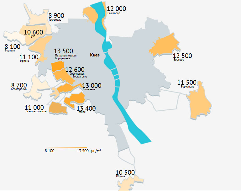 В целом в населенных пунктах, расположенных на расстоянии от 10 до 20 км от столицы, средняя стоимость квадрата в октябре составила 10700 грн. за квадратный метр, что на 4,9% больше, чем в сентябре.