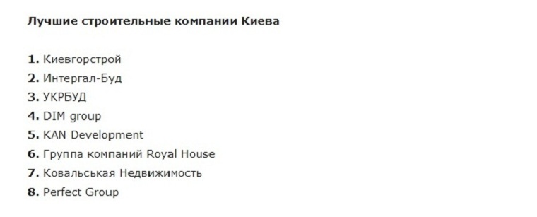 «По данным консалтинговой компании UTG, среди лидеров строительного рынка в 2018 году были компании-застройщики:«Киевгорстрой»,«Укрбуд»,«Интеграл-Буд», STOLITSA Group и «ДСК-Житлобуд». Причем, по информации компании «Евро Рейтинг», среди 250 столичных новостроек большинство новых проектов стартовало в трех компаниях: «Киевгорстрой», «Интеграл-Буд» и «Укрбуд». Лидером стал «Киевгорстрой» — 9 новых проектов», — говорится в материале.