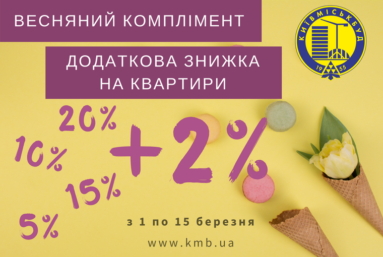 Холдинговая компания "Киевгорстрой" дарит «комплименты» по случаю праздника весны! В течение двух недель каждая дама, которая купит квартиру в одном из жилых комплексов «Киевгорстроя», получит дополнительную скидку — 2%, передает СтройОбзор.