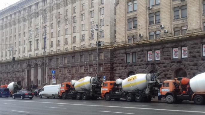 Строители пришли под здание мэрии в рабочей форме, а также привезли с собой бетономешалки, которые выстроили вдоль тротуара. Они периодически начинают стучать касками и требуют, чтобы к ним вышел мэр Виталий Кличко.