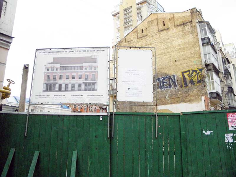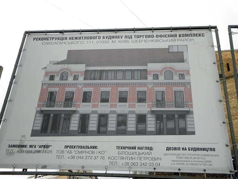 Напомним, что еще 5 сентября 2013 года в центре Киева на улице Саксаганского, 111, межхозяйственная ассоциация «АРКОР» разрушила старинный особняк, в котором жил историк, председатель Украинской Центральной Рады Михаил Грушевский. Здание с хорошей кирпичной кладкой было построено во второй половине XIX века, в 1888 году достроен второй этаж. Последние 7 лет помещение было нежилым. Земельный участок для данного строительства был выделен межхозяйственной ассоциации «АРКОР» по решению Киевского городского совета 28 сентября 2006 года, в период правления Леонида Черновецкого.