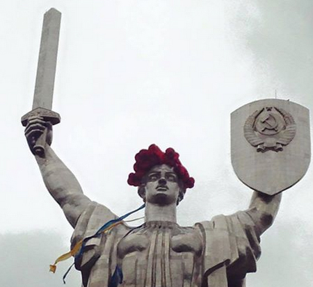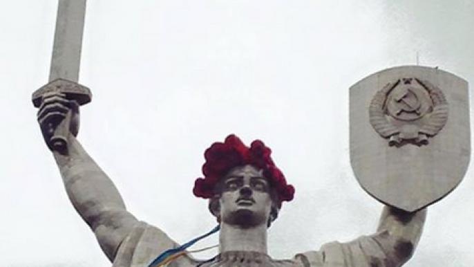 Памятник «Родина-мать» в Киеве украсили венком из желто-голубых лент и цветками мака.