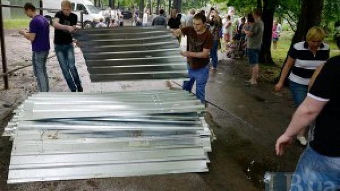 Застройщик привел рабочих и охрану, чтобы восстановить ограду, разрушенную активистами весной.