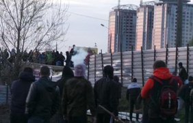 По состоянию на 20:00 люди пытаются разобрать забор. "Титушки" в ответ начали кидать дымовые шашки и петарды, пишет в Твиттере @HromadskeTV.