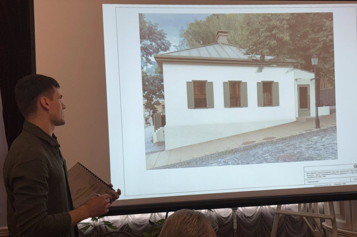 Проект реставрації розробляє фірма зі статутним капіталом лише 100 гривень. Активіст Дмитро Перов опублікував фото із засідання консультативної ради, де видно, що на візуалізаціях відсутній оригінальний дерев'яний декор фасаду — ажурне різьблення карнизу та віконниць.