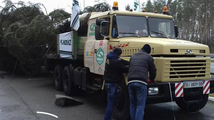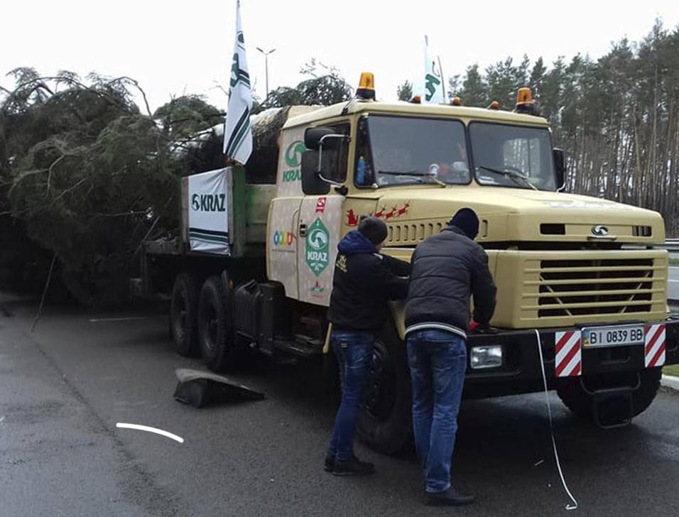Елку срубили еще 2 декабря и отправили в Киев, но из-за плохих погодных условий и заснеженных дорог доставка задержалась.