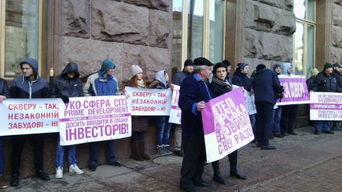 В четверг, 25 декабря, перед зданием Киевского городского совета активисты ОО "Зверинецкий сквер" провели акцию с требованием предоставления земельному участку в Печерском районе столицы официального статуса сквера.