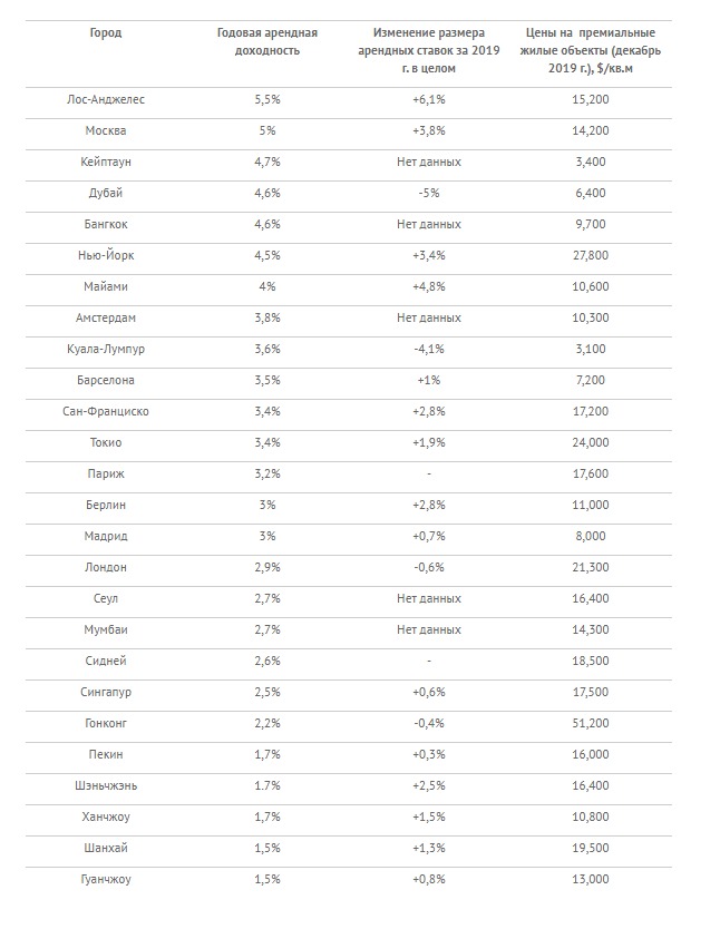 Так, за 2019 год рост арендных ставок (+1,2%) в мегаполисах планеты опередил подъем цен на роскошное жилье (+0,1%).
