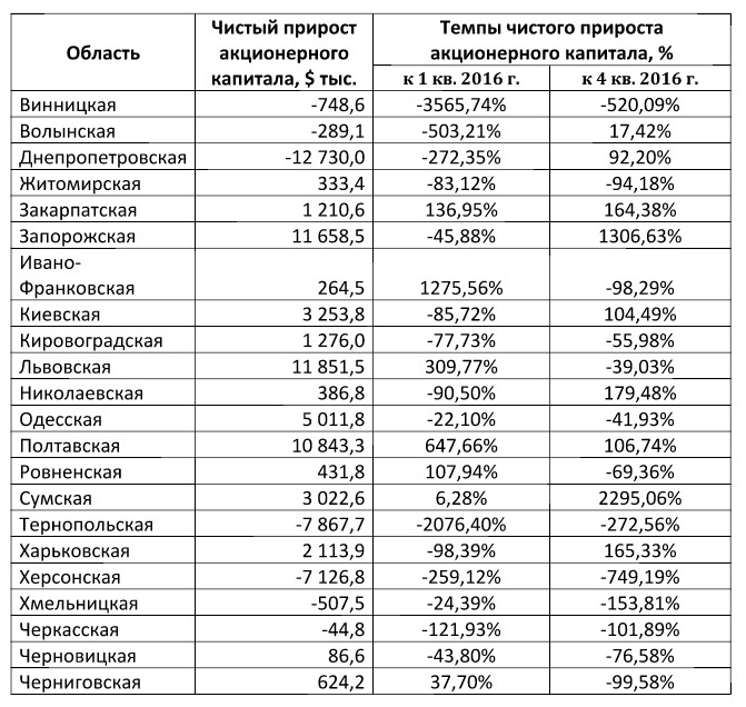 Рост объемов акционерного капитала нерезидентов по регионам Украины