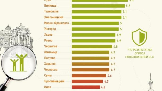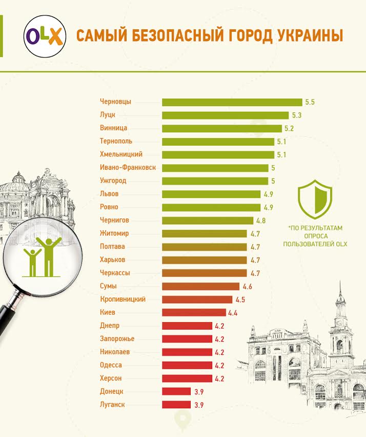 Наиболее безопасным из 26 региональных центров Украины оказался город Черновцы. Согласно оценкам пользователей OLX, административный центр набрал 5,5 балла из 7. Среди прочего местные жители отмечали, что не боятся выходить на улицу в вечернее время. В тройке победителей по критерию «Безопасный город» также оказались Луцк с 5,3 балла и Винница — 5,2 балла.