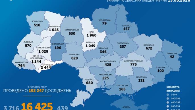 По состоянию на 09:00 13 мая в Украине 16 425 лабораторно подтвержденных случаев Covid-19, из них 439 летальных, 3 716 пациентов выздоровели.
